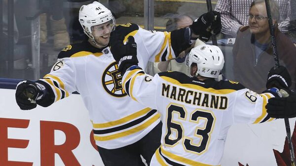 Boston Bruins forward David Krejci celebrates his overtime goal with teammate Brad Marchand in Game 4 against the Toronto Maple Leafs.The Globe and Mail