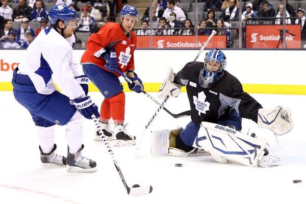 Toronto Maple Leafs Phil Kessel (left) shoots on goaltender James Reimer (right) as Leo Komarov looks on during an open training session at the Air Canada Centre in Toronto on Thursday January 17, 2013, as the Leafs prepare for their opening match of the new NHL season.Chris Young/The Canadian Press