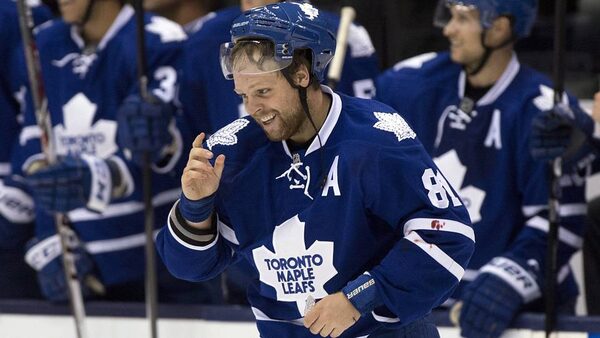 Toronto Maple Leafs Phil Kessel smiles as he is applauded by teammates after winining a fight with Buffalo Sabres Brian Flynn during third period NHL pre-season action in Toronto on Sunday September 22, 2013The Canadian Press