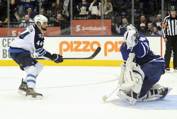 Winnipeg Jets Zach Bogosian (L) scores on Toronto Maple Leafs goalie Ben Scrivens during a shoot out during their NHL game in Toronto March 16, 2013.AARON HARRIS/Reuters