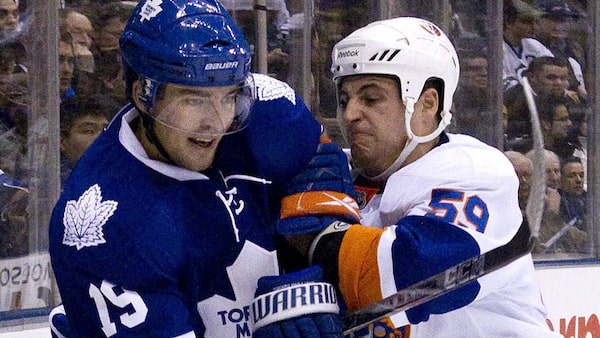 Toronto Maple Leafs Joffrey Lupul (left) clears the puck despite pressure from New York Islanders Michael Haley during first period NHL action in Toronto on Tuesday, February 22, 2011.THE CANADIAN PRESS/Chris YoungChris Young/The Canadian Press