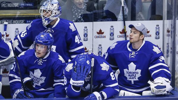 Toronto Maple Leafs (L-R) Jake Gardiner, Jonathan Bernier, Tim Gleason, and James Reimer react against the St. Louis Blues during the last minute of the third period of their NHL hockey game in Toronto, Tuesday March 25, 2014Mark Blinch