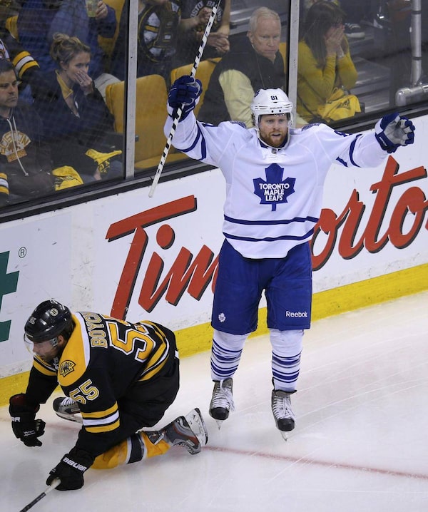 Toronto Maple Leafs' Phil Kessel (R) celebrates his goal in front of Boston Bruins' Johnny Boychuk during the third period of Game 7 of their NHL Eastern Conference quarter-final hockey playoff series in Boston, Massachusetts May 13, 2013.BRIAN SNYDER/Reuters
