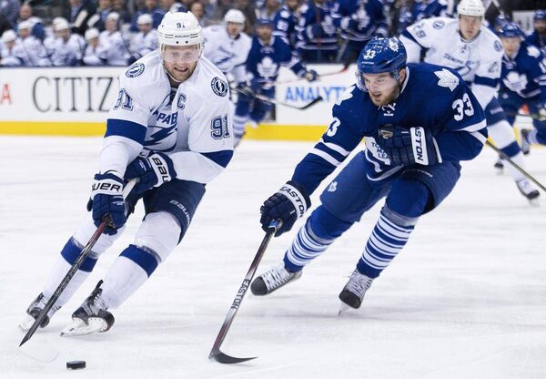 Tampa Bay Lightning forward Steven Stamkos (91) carries the puck past Toronto Maple Leafs defenceman Tim Erixon (33) during first period NHL hockey action in Toronto on Tuesday, March 31, 2015.Nathan Denette/The Canadian Press