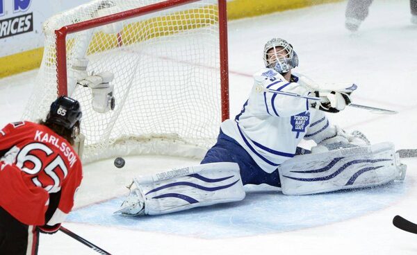 Ottawa Senators' Erik Karlsson blasts a shot past Toronto Maple Leafs' James Reimer during first period NHL hockey action in Ottawa on Wednesday, Jan 21, 2015.The Canadian Press