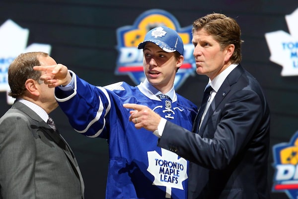 The Toronto Maple Leafs selected Mitch Marner, centre, with the fourth overall pick in the NHL entry draft. Marner fits with the revamped philosophy of the Leafs and coach Mike Babcock, right, which insists that size doesn’t matter without skill, and that skill trumps all – including grit and nationality and so many other intangibles that can cloud the process.Bruce Bennett/Getty Images