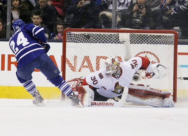 Toronto Maple Leafs forward Peter Holland (24) scores the winning goal on Ottawa Senators goaltender Andrew Hammond (30) in the overtime shootout at the Air Canada Centre. Toronto defeated Ottawa 3-2.John E. Sokolowski