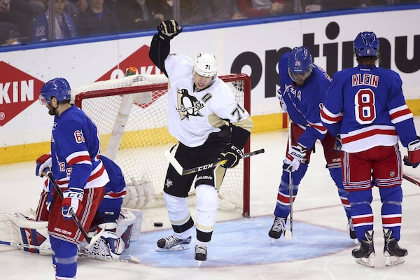 Pittsburgh Penguins centre Evgeni Malkin celebrates scoring on the Rangers during a first-round playoff game at Madison Square Garden in New York, April 21, 2016. The Penguins held a 2-1 lead in the best-of-seven series coming into this Game 4, and scored three goals without reply in the first period.CHANG W. LEE/The New York Times