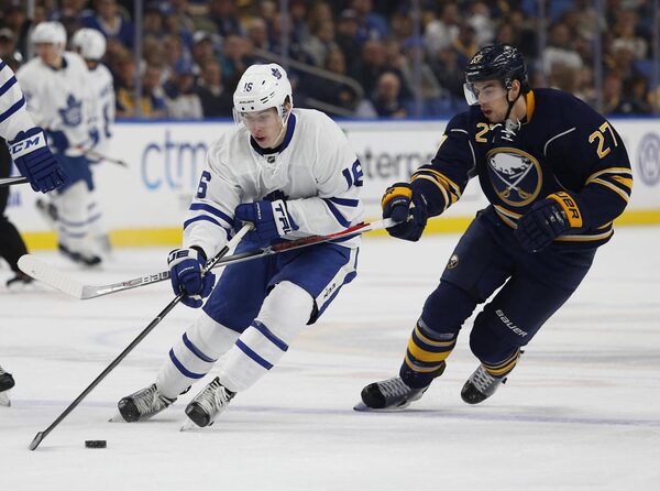 Mitch Marner skates with the puck in front of Sabres centre Derek Grant on Thursday.Timothy T. Ludwig