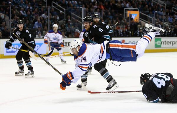 Jordan Eberle #14 of the Edmonton Oilers goes airborne after hitting Tomas Hertl #48 of the San Jose Sharks at SAP Center on March 24, 2016 in San Jose, California.Ezra Shaw/Getty Images