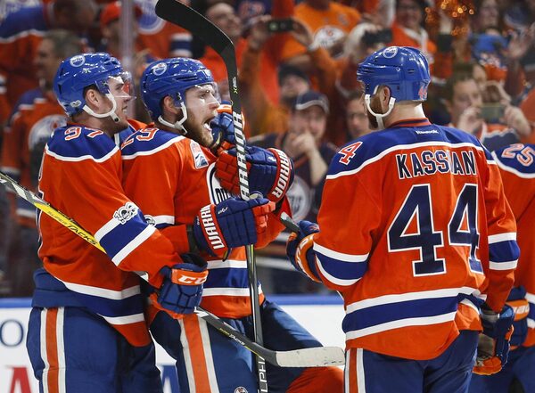 Edmonton Oilers’ Connor McDavid, left, Leon Draisaitl, centre, and Zack Kassian celebrate their overtime win in Game 5 in Edmonton.Jeff McIntosh/The Canadian Press