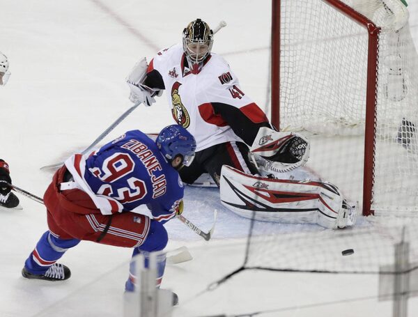 The New York Rangers’ Mika Zibanejad is stopped on a shot by Ottawa Senators’ goalie Craig Anderson during Game 3 of their second-round playoff series on Tuesday, May 2, 2017.Frank Franklin II/The Associated Press