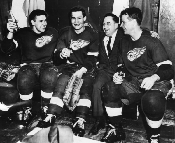 These happy Red Wings join coach Jimmy Skinner in their Detroit dressing room to celebrate their 3-2 victory over Toronto Maple Leafs in Stanley Cup semi-final series opener, in Detroit March 20, 1956. From left are Alex Delvecchio, Johnny Bucyk, Skinner and Gordie Howe.The Associated Press