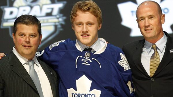 Morgan Rielly, centre, a defenseman, stands with officials from the Toronto Maple Leafs after being chosen fifth overall in the first round of the NHL hockey draft on Friday, June 22, 2012, in Pittsburgh.The Associated Press