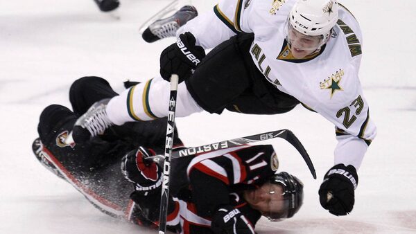 Dallas Stars Tom Wandell (top) trips over Ottawa Senators Daniel Alfredsson during the first period of their NHL hockey game in Ottawa November 24, 2010. REUTERS/Chris WattieCHRIS WATTIE/Reuters