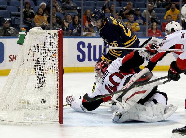 Buffalo Sabres left wing Matt Moulson (26) scores a goal on Ottawa Senators goalie Robin Lehner (40) during the second period at First Niagara Center.Timothy T. Ludwig