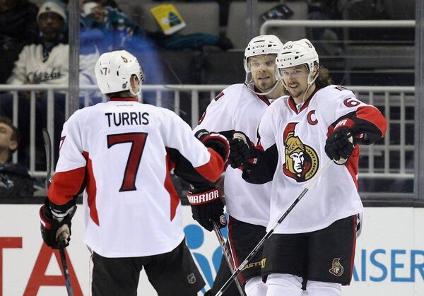 Erik Karlsson of the Ottawa Senators is congratulated by Milan Michalek and Kyle Turris after he scored a goal in the second period of their game against the San Jose Sharks at SAP Center on February 28, 2015.Ezra Shaw/Getty Images