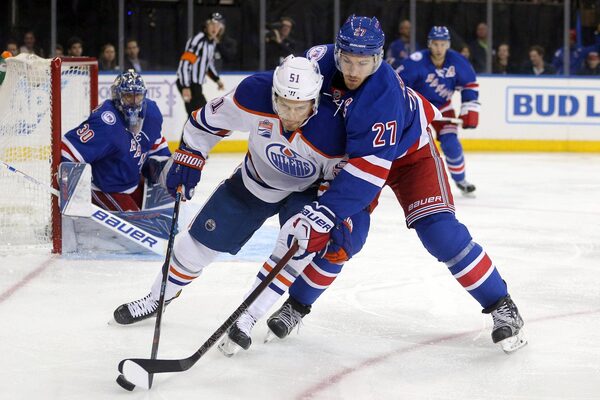 Oilers centre Anton Lander and Rangers defenseman Ryan McDonagh fight for the puck during the third period.Brad Penner