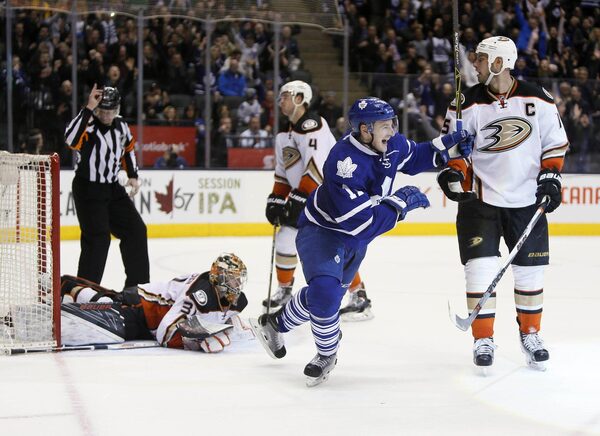 Toronto Maple Leafs forward Zach Hyman (11) celebrates the game winning goal by forward Nazem Kadri (not pictured) as Anaheim Ducks forward Ryan Getzlaf (15) and defenceman Cam Fowler (4) and goaltender Frederik Andersen (31) look on at the Air Canada Centre in Toronto on Thursday, March 24, 2016. Toronto defeated Anaheim 5-4 in overtime.John E. Sokolowski