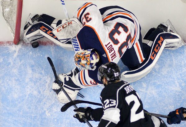 In this Feb. 24, 2018, file photo, Los Angeles Kings right wing Dustin Brown, below, puts the puck over the line past Edmonton Oilers goaltender Cam Talbot with seconds to go in the third period of an NHL hockey game in Los Angeles.Mark J. Terrill