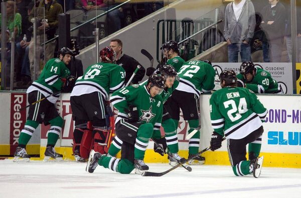 Play is stopped during the Dallas Stars and Columbus Blue Jackets game while team officials check out center Rich Peverley (not pictured) during the first period at the American Airlines Center.Jerome Miron