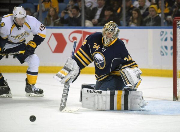 Nashville Predators centre Craig Smith battles for a loose puck in front of Buffalo Sabres goaltender Michal Neuvirth during the second period of an NHL hockey game Sunday, Feb. 22, 2015, in Buffalo.Gary Wiepert/The Associated Press
