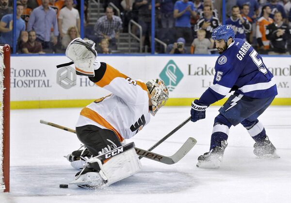 Tampa Bay Lightning defenseman Jason Garrison (5) slips the puck under Philadelphia Flyers goalie Steve Mason (35) to score the game-winning goal in overtime during an NHL hockey game Thursday, Oct. 8, 2015, in Tampa, Fla.Chris O'Meara/The Associated Press