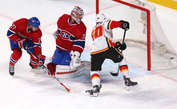 Flames centre Markus Granlund scores a goal in the first period as Carey Price and Alex Galchenyuk look on.Jean-Yves Ahern