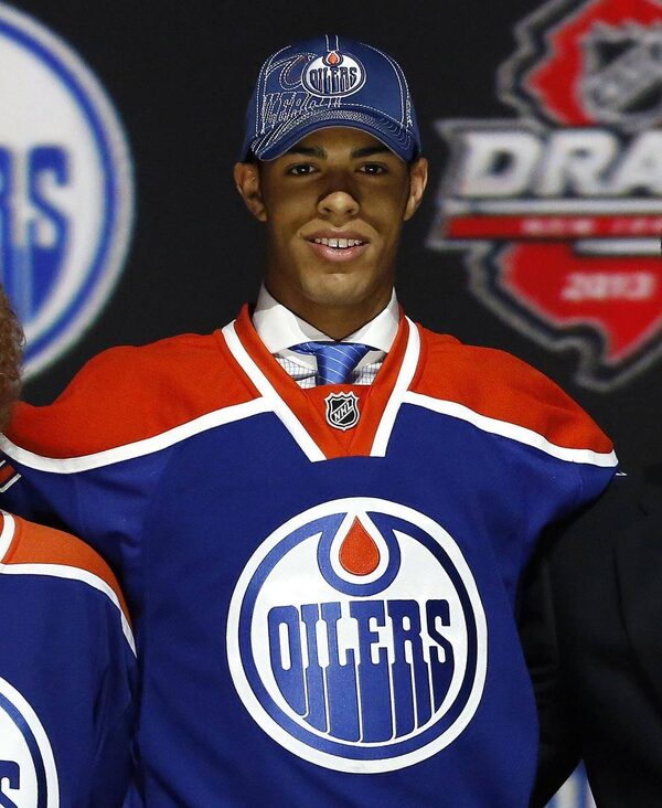 Darnell Nurse wears an Edmonton Oilers jersey after being selected by the Oilers as the seventh overall pick in the 2013 National Hockey league (NHL) draft in Newark, New Jersey, June 30, 2013.BRENDAN MCDERMID/Reuters