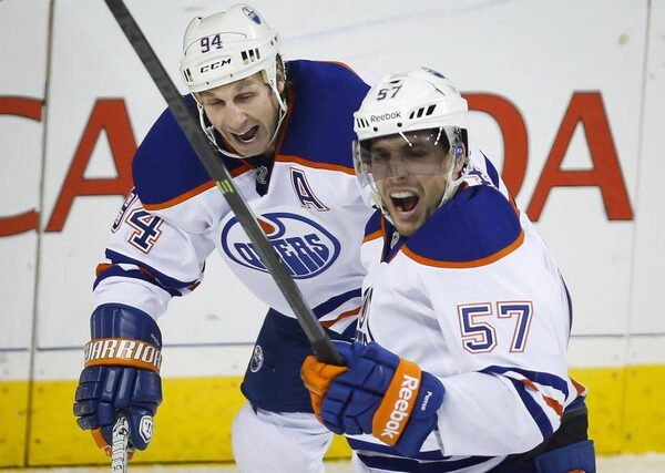 Edmonton Oilers' David Perron, right, celebrates his game-winning goal with teammate Ryan Smyth during third period NHL hockey action against the Calgary Flames in Calgary, Alta., Saturday, Nov. 16, 2013. The Edmonton Oilers beat the Calgary Flames 4-2.JEFF MCINTOSH/The Canadian Press