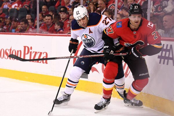 Edmonton Oilers left wing Milan Lucic (27) battles for the puck with Calgary Flames defenseman Dougie Hamilton (27) during the second period at Scotiabank Saddledome in Calgary. Oilers won 7-5.Candice Ward/The Globe and Mail