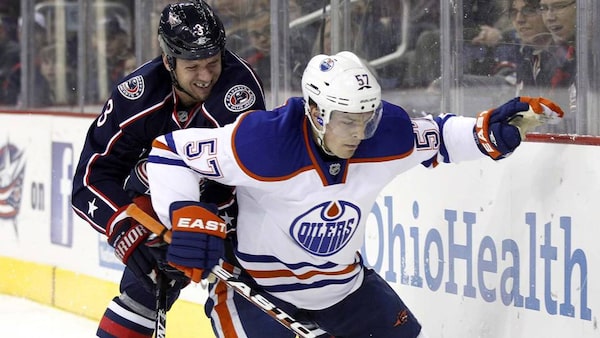 Edmonton Oilers' Anton Lander (R) fights for the puck with Columbus Blue Jackets' Marc Methot during the first period of their NHL hockey game in Columbus, Ohio January 17, 2012.Reuters