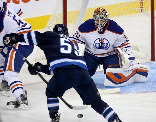Winnipeg Jets' Mark Scheifele skates in to shoot on Edmonton Oilers goalie Richard BachmanTrevor Hagan/The Canadian Press