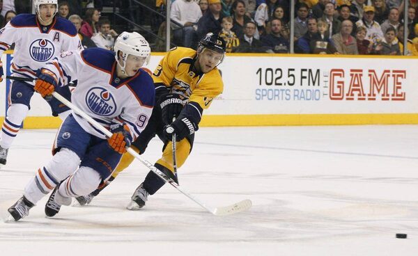 Nashville Predators' Nick Spaling (R) battles for the puck with Edmonton Oilers' Ryan Nugent-Hopkins (L) during the third period of their NHL hockey game in Nashville, Tennessee March 25, 2013.HARRISON MCCLARY/Reuters