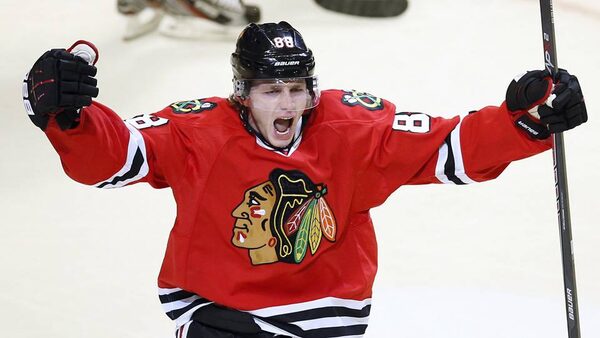 Chicago Blackhawks' Patrick Kane celebrates his goal against the Calgary Flames during the first period of their NHL hockey game in Chicago, Illinois, April 26, 2013.Reuters