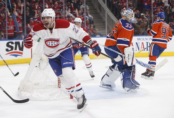 Montreal Canadiens centre Alex Galchenyuk celebrates a goal against Edmonton Oilers goalie Cam Talbot during third period NHL action in Edmonton, Alta., on March 12, 2017.JASON FRANSON/The Canadian Press