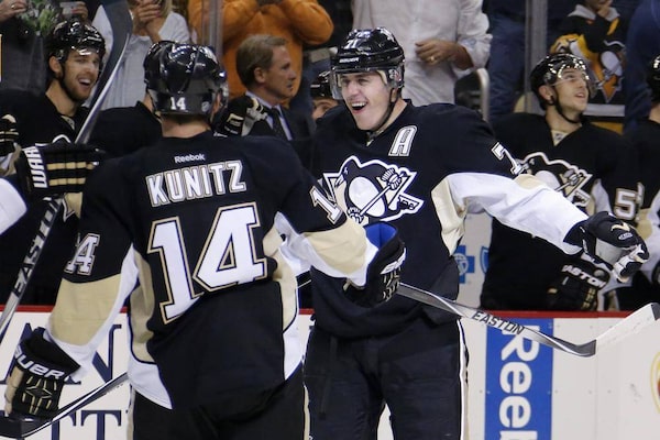 Pittsburgh Penguins' Evgeni Malkin (71) celebrates assisting on a goal by Patric Hornqvist during the second period of an NHL hockey game against the New York Islanders in Pittsburgh, Saturday, Oct. 18.Gene J. Puskar/The Associated Press
