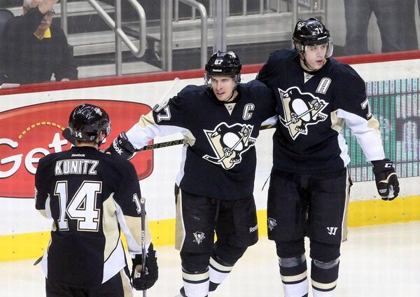 Pittsburgh Penguins left wing Chris Kunitz (14) and center Evgeni Malkin (71) celebrate a goal by center Sidney Crosby (87) against the Edmonton Oilers during the second period at the CONSOL Energy Center.Charles LeClaire