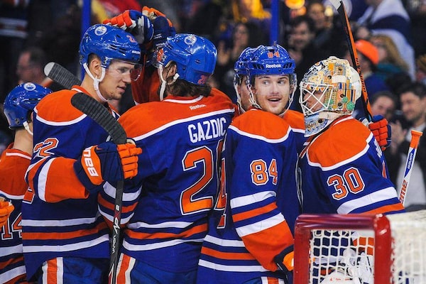(L to R) Keith Aulie #22, Luke Gazdic #20, Oscar Klefbom #84 and Ben Scrivens #30 of the Edmonton Oilers celebrate after defeating the San Jose Sharks during an NHL game at Rexall Place on December 7, 2014 in Edmonton, Alberta, Canada.Derek Leung/Getty Images