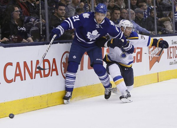 St. Louis Blues forward Troy Brouwer (36) keeps Toronto Maple Leafs forward James van Riemsdyk (21) from getting to the puck during the first period at the Air Canada Centre in Toronto on Saturday, Jan. 2, 2016.John E. Sokolowski