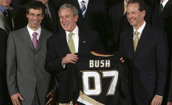 Former U.S. president George W. Bush poses with members of the 2007 NHL Stanley Cup Champion Anaheim Ducks, Scott Niedermayer, left, and owner Henry Samueli, right, during a ceremony honoring the team, Wednesday, Feb. 6, 2008, in the East Room of the White House.