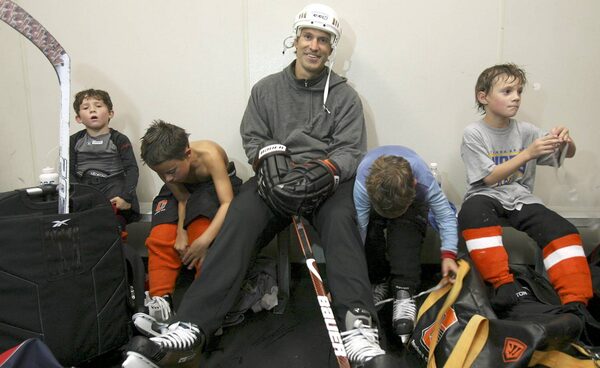 NHL great Scott Niedermayer, centre, sits with Tommy Cianfrani, 6, left, C.J. Girard, 8, his son Joshua, 6, and Luc Monaco, 8, after their practice at the Ice Palace in Aliso Viejo, Calif., on Sept. 20, 2010.Ann Johansson