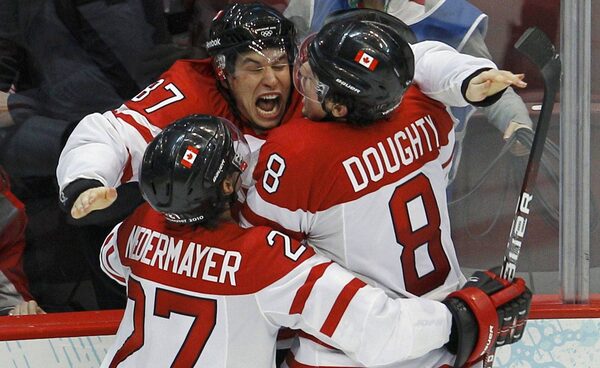 Canada's Sidney Crosby celebrates with teammates Scott Niedermayer, left, and Drew Doughty after scoring the game winning goal against the U.S. during overtime in their men's ice hockey gold medal game at the Vancouver 2010 Winter Olympics February 28, 2010.Reuters