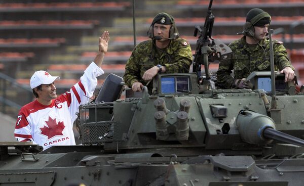 Team Canada's men's hockey captain Scott Niedermayer waves to the crowd while being driven to the stage in a military light armoured vehicle during the "Canada Celebrates" event in Edmonton June 28, 2010.Reuters