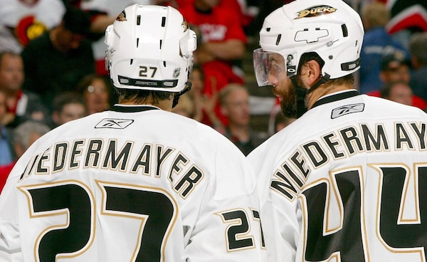 Rob Niedermayer of the Anaheim Ducks speaks to brother Scott Niedermayer during the third period of Game 4 of the 2007 Stanley Cup finals on June 4, 2007 at Scotiabank Place in Ottawa, Canada.Getty Images