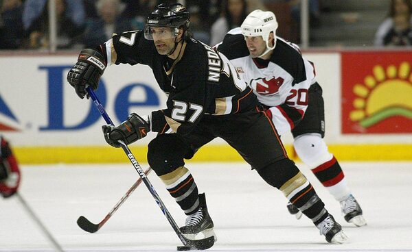 Scott Niedermayer of the Anaheim Ducks skates the puck through the netural zone against the New Jersey Devils in the third period during their game at Honda Center on November 24, 2006 in Anaheim.Getty Images
