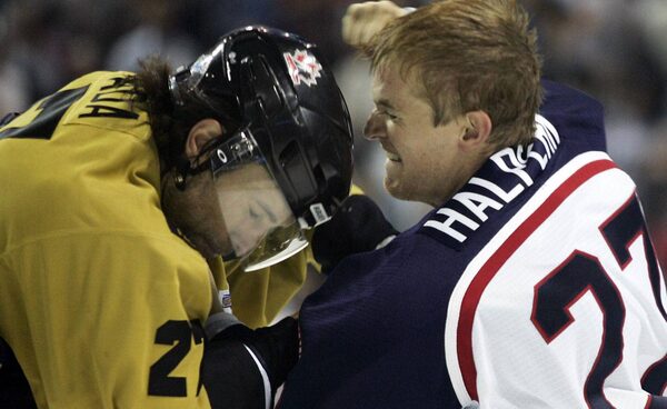 Team USA Jeff Halpern forward and Team Canada defenceman Scott Niedermayer square off during second period World Cup of Hockey Tuesday, August 31, 2004 in Montreal.The Canadian Press