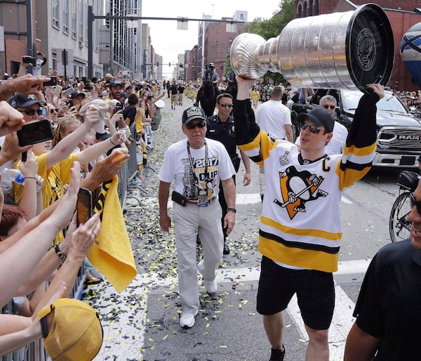 Pittsburgh Penguins' Sidney Crosby hoists the Stanley Cup for fans during the team's Stanley Cup NHL hockey victory parade on Wednesday, June 14, 2017, in Pittsburgh. The Stanley Cup champion Pittsburgh Penguins say they've accepted an invitation from Donald Trump to visit the White House, while players, coaches and owners in the NFL and NBA have been involved in an escalating war of words with the U.S. president.Gene J. Puskar/The Associated Press