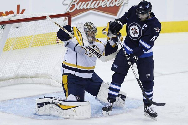 Nashville Predators goaltender Pekka Rinne gets his sleeve on the deflection from Winnipeg Jets' Andrew Ladd during first period NHL action in Winnipeg on Friday, October 17, 2014.JOHN WOODS/The Canadian Press