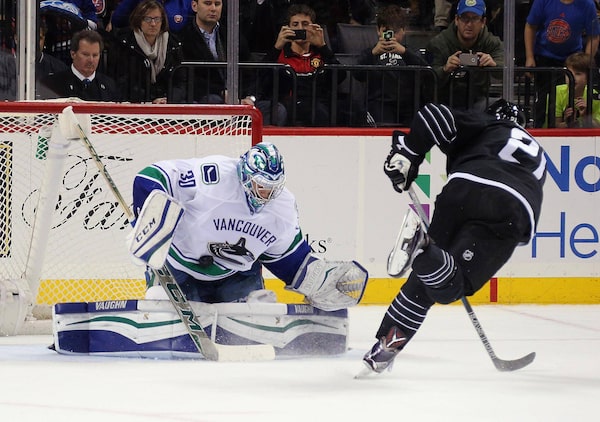 Ryan Miller (30) of the Vancouver Canucks makes a chest save against Kyle Okposo #21 of the New York Islanders in the shootout at the Barclays Center on January 17, 2016 in the Brooklyn borough of New York City. The Canucks defeated the Islanders 2-1 in the shootout.Bruce Bennett/Getty Images